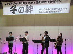 Home アーティストバンク 1/12 安井校区「冬の絆」に新田千尋さん(サクソフォン)が出演しました news お知らせ 1/12 安井校区「冬の絆」に新田千尋さん(サクソフォン)が出演しました 2020/01/13 アーティストバンク 堺区の安井小学校で行われた、「冬の絆2020」に新田千尋さんが出演。 「安井夏夜祭」で人気を博したサクソフォン四重奏で、再び会場を盛り上げてくれました!息ぴったりの演奏に、会場からは大きな拍手をいただきました。 メンバーも、お祭りを楽しんでくれたようです。また来年もステージに登場するかも…どうぞご期待ください! 次の記事へ 全ての記事を見る 前の記事へ
