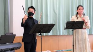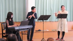 この日やってきたのは、フルートのお兄さん・辻井義祐さんと、フルートお姉さん・要枝三里さん、そしてピアノのお姉さん・河合琴絵さんの3人です。