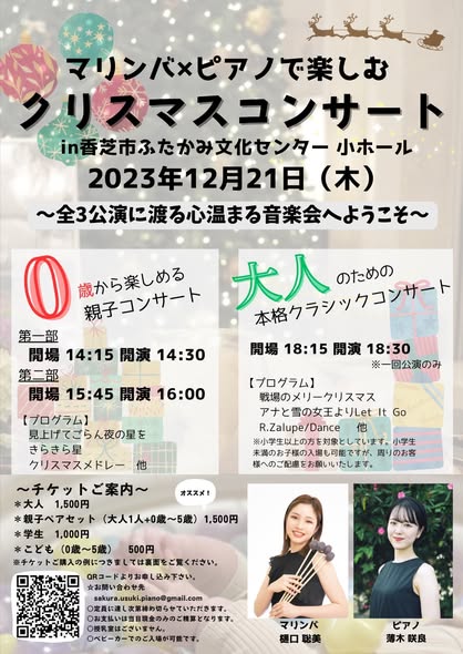 ピアノの薄木咲良さんが、樋口聡美さん(マリンバ)とクリスマスコンサートを開催します!