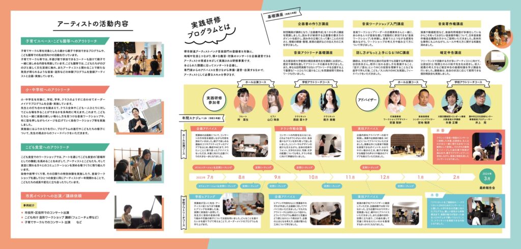 活動内容は、登録アーティスト募集パンフレットや堺市新進アーティストバンクHP(https://www.sakai-bunshin.com/artistbank/)の活動報告をご覧ください。