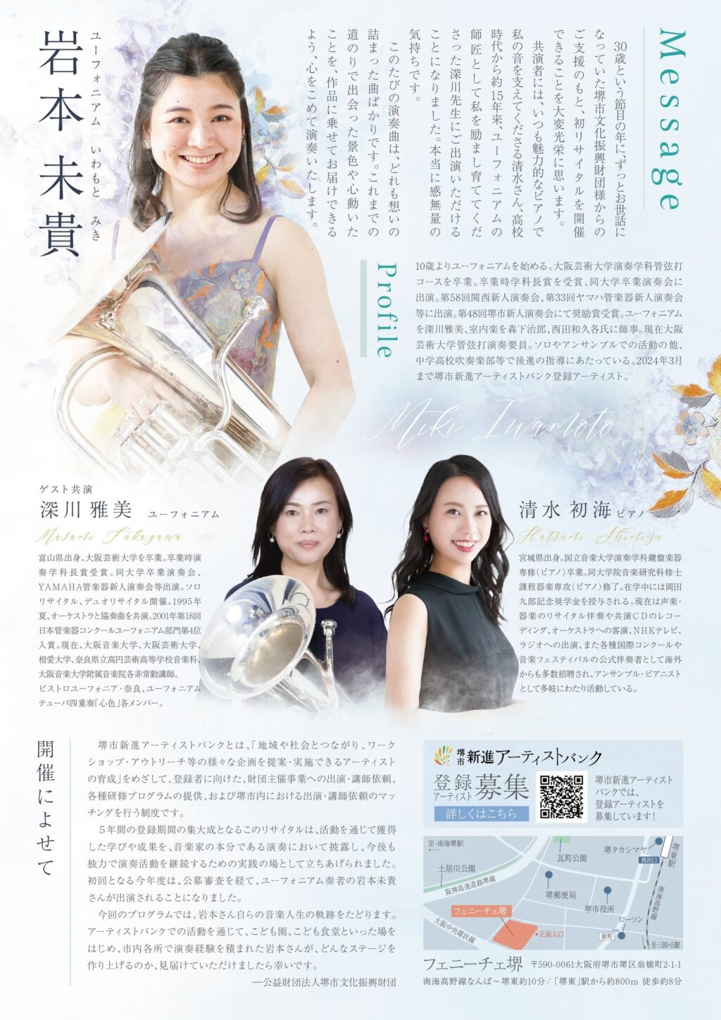 詳しくは、ホームページをご覧ください→https://www.sakai-bunshin.com/event/recital_mikiiwamoto/
