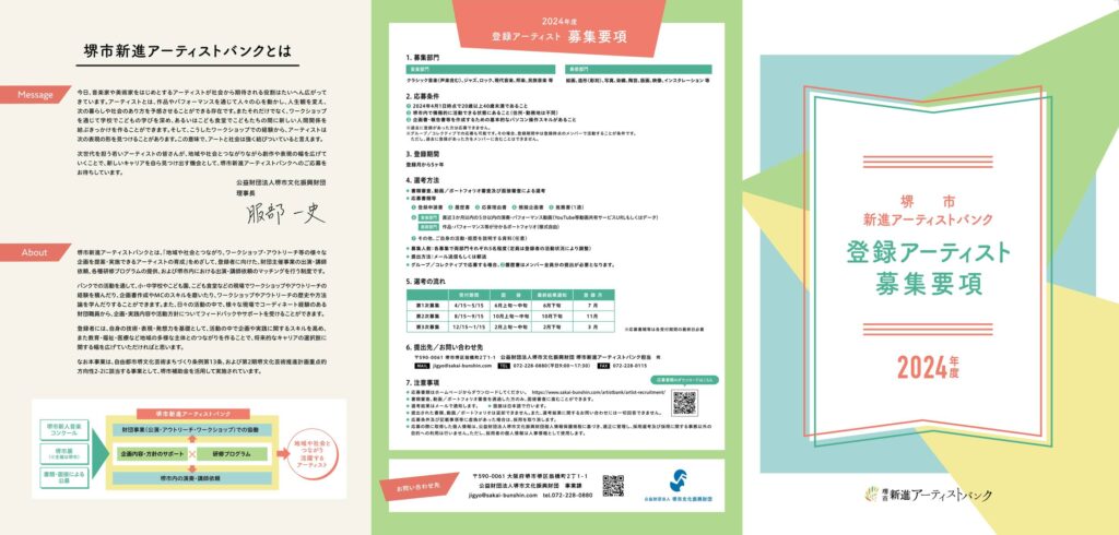 活動内容は、登録アーティスト募集パンフレットや堺市新進アーティストバンクHP(https://www.sakai-bunshin.com/artistbank/)の活動報告をご覧ください。