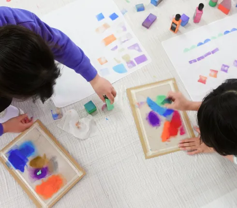 墨で「マーブリング」を体験しました。完成した作品を見せ合いながら、墨の流し方や水面への落とし方など、工夫したことを生き生きと話していました。ふだんは子どもと関わる機会が少ないので、とても良い時間でした!