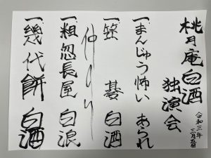 Home イベント 桃月庵白酒 独演会 event 桃月庵白酒 独演会 Share スケジュール チケットを購入する チケット購入ガイドはこちら 演目:「幾代餅」他 20210305演目一覧 基本情報 チケットを購入する チケット購入ガイドはこちら 開催イベント #講座・講演 泉北ニュータウンの名建築講座 栂文化会館 2026/03/20 #ワークショップ 「紐とけば堺2026」関連イベント ミュシャのオリジナルデザインカード作り 堺市立文化館 2026/03/20〜2026/03/22 #講座・講演 絵てがみ教室(火曜コース) 栂文化会館文化講座【令和8年度】 栂文化会館 2026/04/21、2026/05/19、2026/06/16、2026/07/21、2026/08/18、2026/09/15