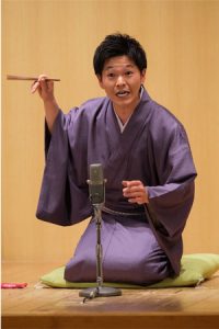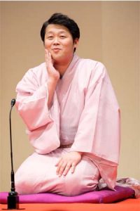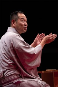 英語落語をひっさげて世界28か国を駆けまわった実績の持ち主なのですから、日本なんて狭いものです。世界に飛び出したおかげで、「落語」を客観的に見つめなおして、より楽しくお客様にお届けするにはどうすればいいか…を考え続けるアイデアマンになりました。現代を描いた自作の新作だけでなく、先人から受け継いだ古典にも、ちゃんと今の人の視点でチェックを入れています。ビリケンさんという福の神に似ているので、衣装の紋にはビリケンの顔を使っています。笑いの福の神の落語はビギナーからマニアまでお薦めです。