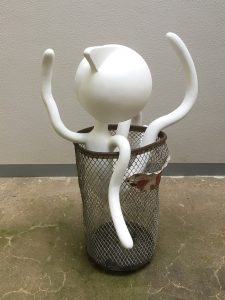 発泡スチロールや樹脂、スカルピー粘土、土粘土など様々な素材を用いて人間関係のややこしさや自身が生活の中で思う言葉にできない気持ちを白マットの人間のような形の中で表現しています。
