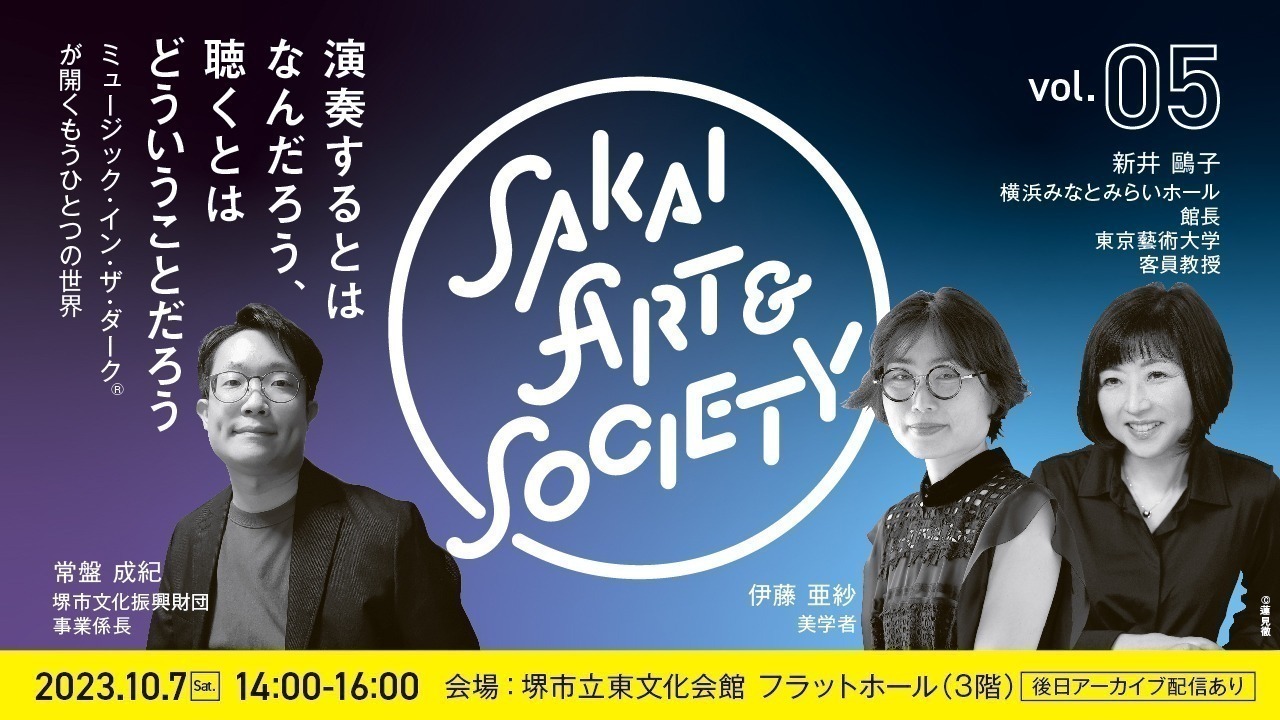 ミュージック・イン・ザ・ダーク®は、視覚障害のある音楽家とない音楽家が、あかりを完全に消した空間でともに演奏することで、舞台で演奏する人も、客席で演奏を聴く人も、視覚以外の感覚をとぎすませて音楽を体感するコンサートです。2015年に東京藝術大学奏楽堂で始まり、これまで東京・横浜で開催されてきた本公演を、このたび初めて関西・堺で上演いたします。この公演が、目の見える人、見えない人、見えにくい人、あらゆる人にとって音楽との新しい出会いの場となること、私たちひとりひとりの音楽の楽しみ方を互いに想像し、共有する機会となることを願っております。