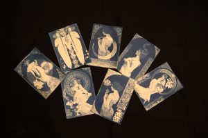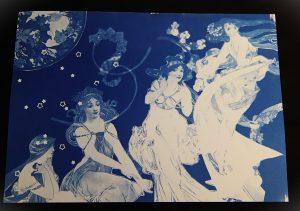 フィルムになったミュシャと夢二のモチーフを組み合わせ自由にコラージュして焼き付けると、青色のオリジナル写真カード(サイアノフォトグラフ)ができあがります。