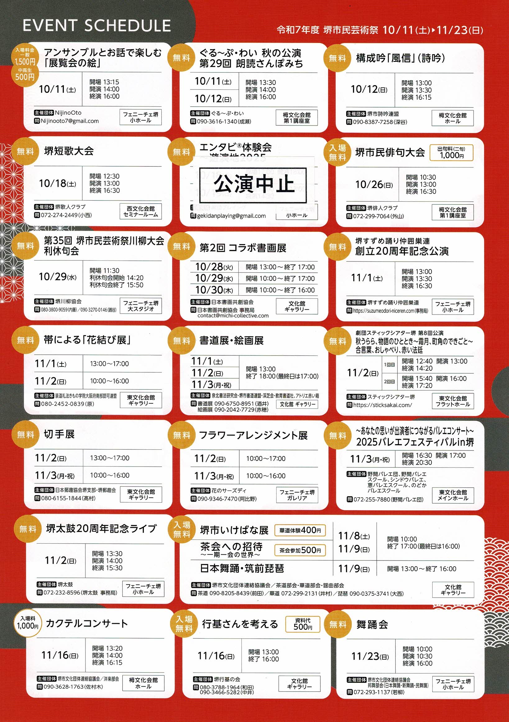 Home イベント 行基さんを考える event 行基さんを考える Share スケジュール 2025/11/16 会場 堺市立文化館 開館時間 ・休館日 公式サイトでご確認ください 資料代 500円 基本情報 会場 堺市立文化館 住所: 〒590-0014 大阪府堺市堺区田出井町1-2-200 ベルマージュ堺弐番館2F~4F 最寄駅: JR阪和線堺市駅下車徒歩約3分 南海バス:阪和堺市駅前 TEL: 072-222-5533 FAX: 072-222-6833 堺市立文化館ギャラリー 3階やなぎ1・2 入場 無料 主催団体 堺行基の会 公演チラシPDF 開催イベント #ワークショップ 「紐とけば堺2026」関連イベント ミュシャのオリジナルデザインカード作り 堺市立文化館 2026/03/20〜2026/03/22 #展示 大阪・関西万博の壁画デザインを手がけたアーティストAju作品展 堺市立文化館 2026/02/26〜2026/03/01 #演劇 劇団スティックシアター堺 第9回公演 朗読劇集『ここに、春がある。』 堺市立文化館 2026/03/28