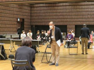 最初にフェニーチェ堺から公演担当の青木ならびに舞台監督を務める橋詰、統括役の柴坂がご挨拶をし、今作の意義と、無事に当日を迎えるための諸注意をお伝えしたあと、合唱指導の益子 務先生にバトンタッチします。