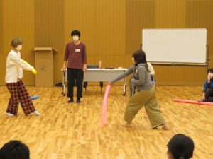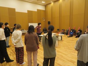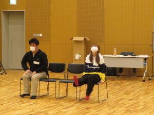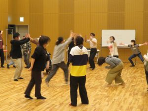 みなさんの緊張を解くアイスブレイクとして、お互いの名前を覚える楽しいゲームをしたあと、演劇の『表現主義』と『存在主義』について少し解説し、「目隠しチャンバラ」というゲーム形式でさっそく実演。