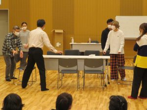 駅のベンチをそっと奪い合う即興劇では、藤井颯太郎さんに耳打ちで割り当てられた「テンション」で演技するグループと、それを観て各人がどの「テンション」で演じているのかを当てるグループとで、大いに盛り上がりました。