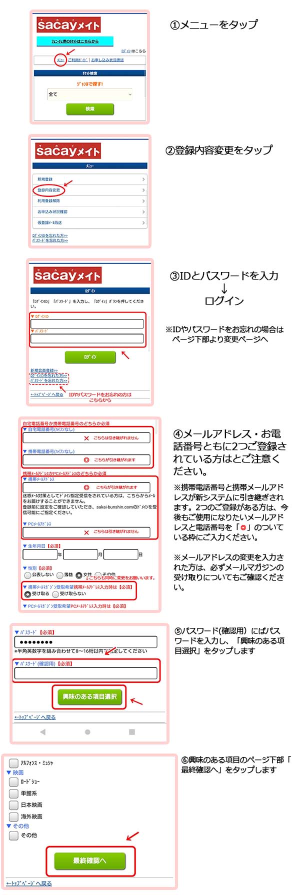 変更(1つに選択)されない場合は、自動的に携帯メールアドレス/携帯電話番号として登録されている内容が、登録情報として新システムへ引き継がれます。PCメールアドレス(Gmailやブラウザ)と自宅電話番号での登録を希望されるお客様は、3月30日(水)17:00までに、ご自身のsacayメイト登録内容をご確認の上、今後も使用される【メールアドレスと電話番号】に変更してください。