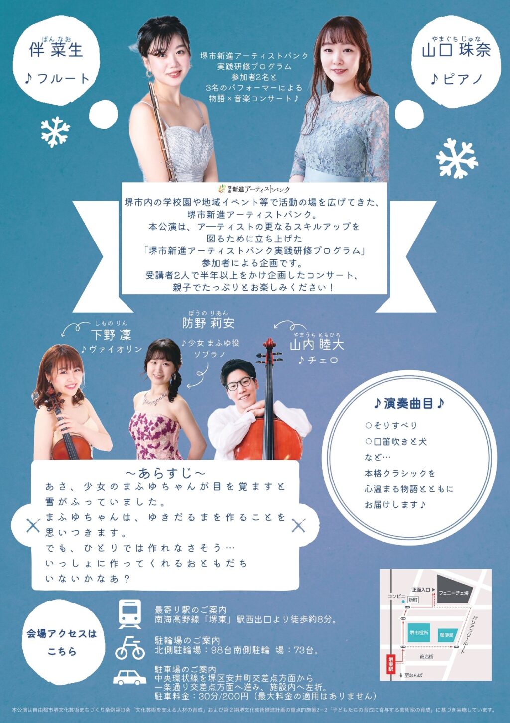 堺市新進アーティストバンク音楽部門の登録アーティストを対象とした、実践研修プログラム(ホール公演コース)の集大成となるコンサートのチラシが完成しました!