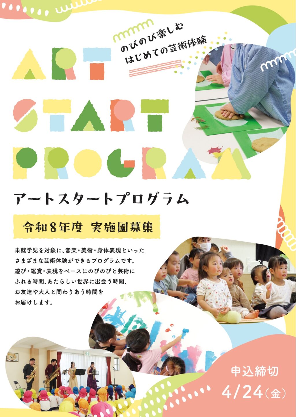 堺市内の認定こども園等で、アーティストが音楽・造形・粘土・身体表現体験プログラムを実施する、アートスタートプログラムの2026年度の実施園募集が始まります!