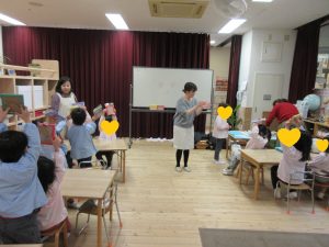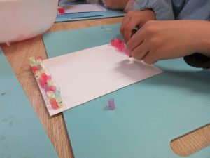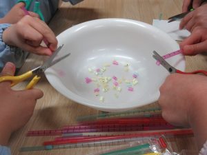 ストローをみんなで細かく切って、色を選びながら台紙に並べていきます。細やかな作業はとても個性がにじみでます。大胆に並べていく子、慎重にぴっちり並べる子、先生のお見本に忠実だったり、独創的にどんどん並べていったり。見ているだけでとても楽しかったです。