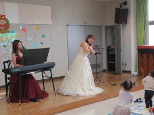 「おおきなくりの木の下で」や「パンダうさぎコアラ」などの手遊び歌を中心に、一緒に体を動かしました後は、「いのちの歌」や「アメイジング・グレイス」といった曲も披露してくださり、涙ぐむお母さんも見かけました。