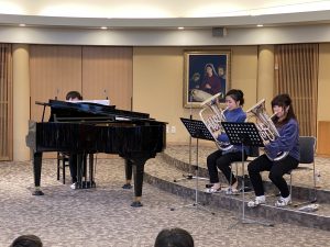 ユーフォニアムの柔らかな音色で、「メヌエット」や「フニクリ・フニクラ」などを奏でましたあとは、園で練習していた「世界中の子どもたちが」を演奏。