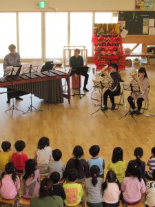 演奏中は手の動きをまねする子もおり、教室に帰っても箱をたたいたりして、興味をもってくれたようです。