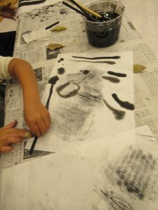 まずは、フロッタージュから…葉っぱや布などの模様をこすり取った後は、濃さの違う墨でお絵かきです。