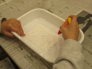ボンドでお絵かきした後は、塩を全面に振りかけ、塩の上から絵の具を垂らしていきます。