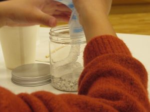 まずは、ビンの中に保冷剤を詰めていき、飾りを好きな位置に入れていきます。