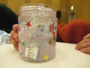 ビンの中に、お花や海の生き物、プレゼントなどを詰めて、飾りをつくります。