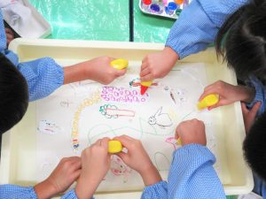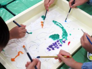 そして、「せーの!」でボンドの上から塩をバサーッと振りかけた後、絵の具をポタポタ垂らして色を付けたら…とってもすてきな絵が出来上がりました!