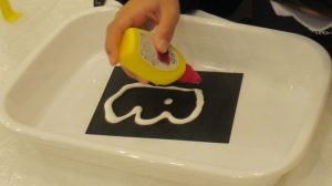 そして塩の上から、ちょんちょんと絵の具を付けていくと、その絵の具が鮮やかに塩に浸透していきます。