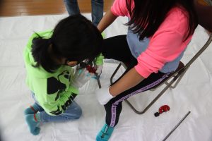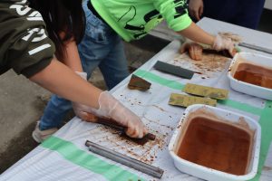 鉄のお話を聞いた後は土台作り、鉄パイプの切断、研磨の作業に分かれて、いよいよスタート!