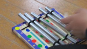 ゴムを引っ張ったり寄せたり、一生懸命に5本の鉄琴を組み合わせて作り上げました。