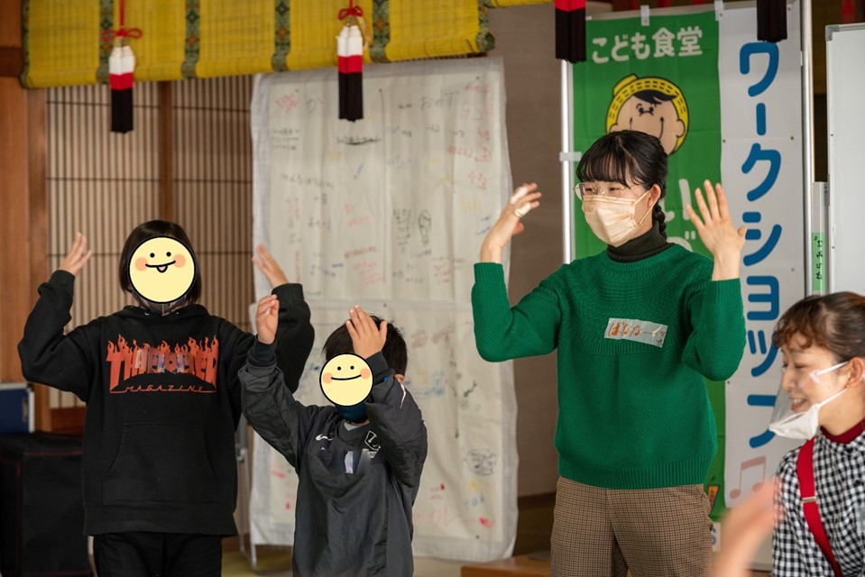 ファシリテーター古橋果林さんの合図で身体をほぐしたら、早速「いづはまスマイル食堂のうた」の練習に入ります。