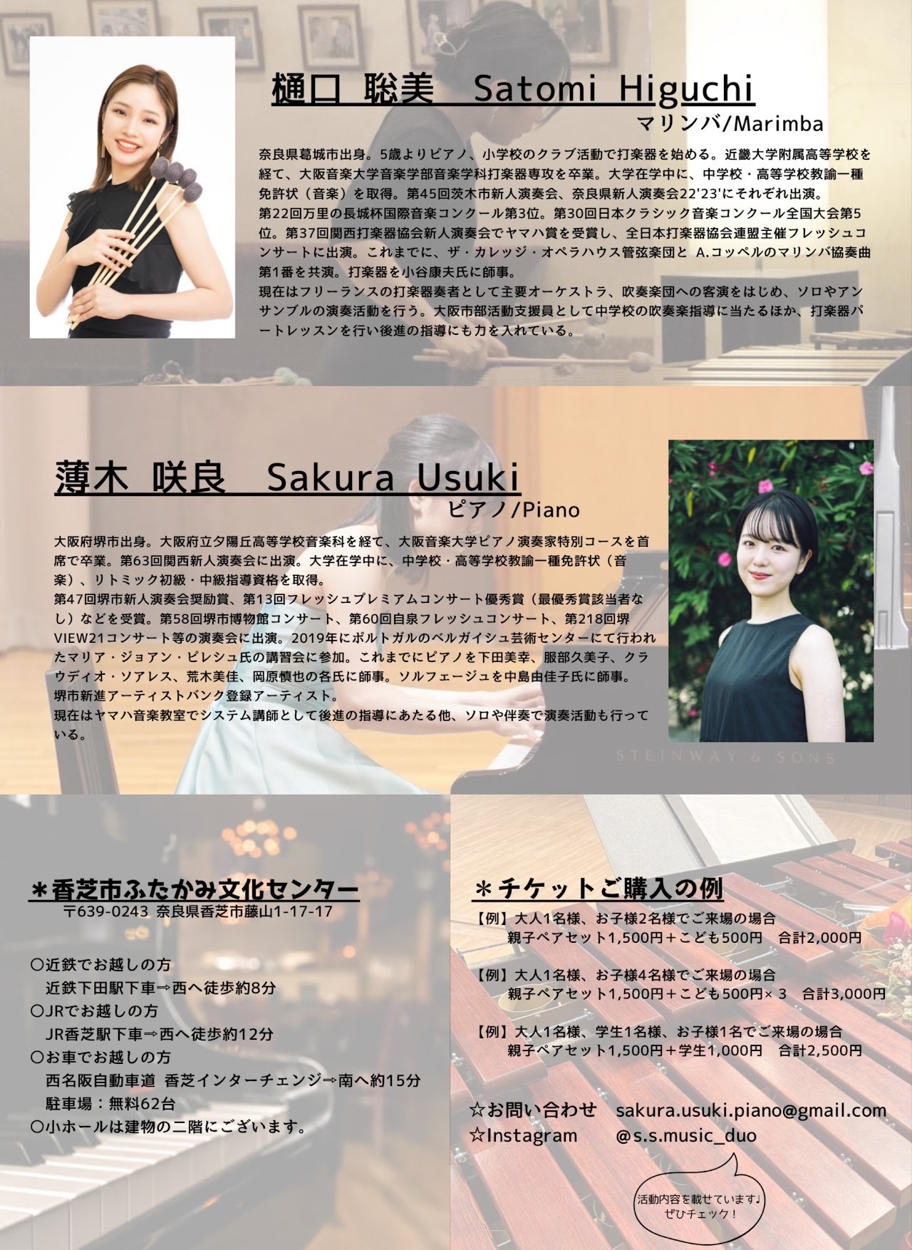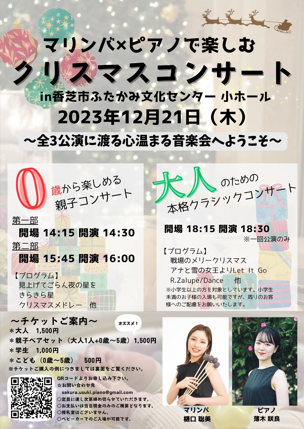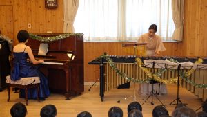 保育園に来てくれた、薄木咲良さんと樋口聡美さんのコンサートが、12月21日に「マリンバ×ピアノで楽しむクリスマスコンサート」を開催されます。