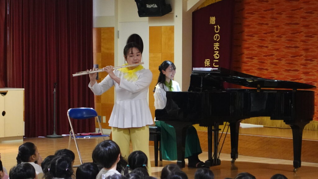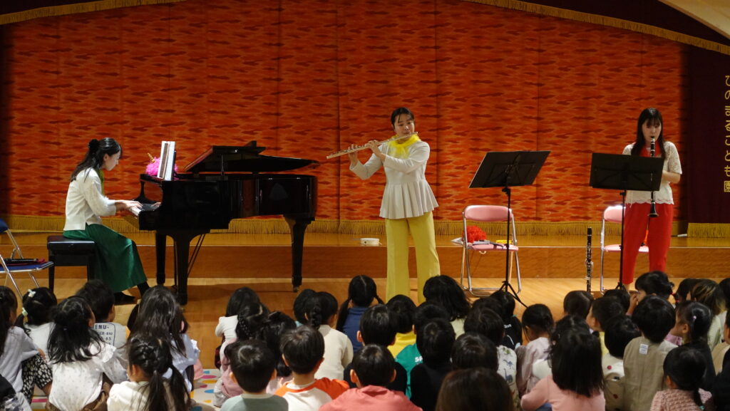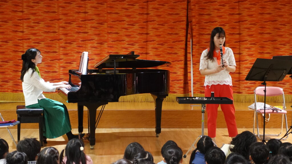 ピアノの演奏では、柔らかなきらめきを味わい、いつも知っているピアノとは、また違った面を見られましたね。クラリネットは分解しながら演奏する曲で、その構造にびっくり!こどもたちはもちろん、先生方も驚いていた様子でした。つづいて、フルートの演奏では、「赤とんぼ」で秋の訪れを感じ、ゆったりとした時間が流れていましたが…