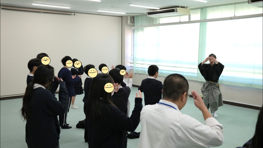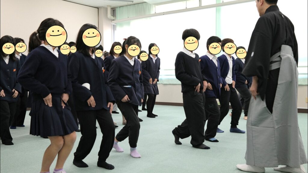普段とは異なる狂言の姿勢に、苦戦する姿も見られましたが、ワークショップ中盤には、みんなが基本の姿勢を保ったまま、見事すり足を習得していました。