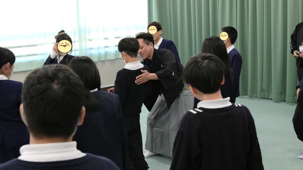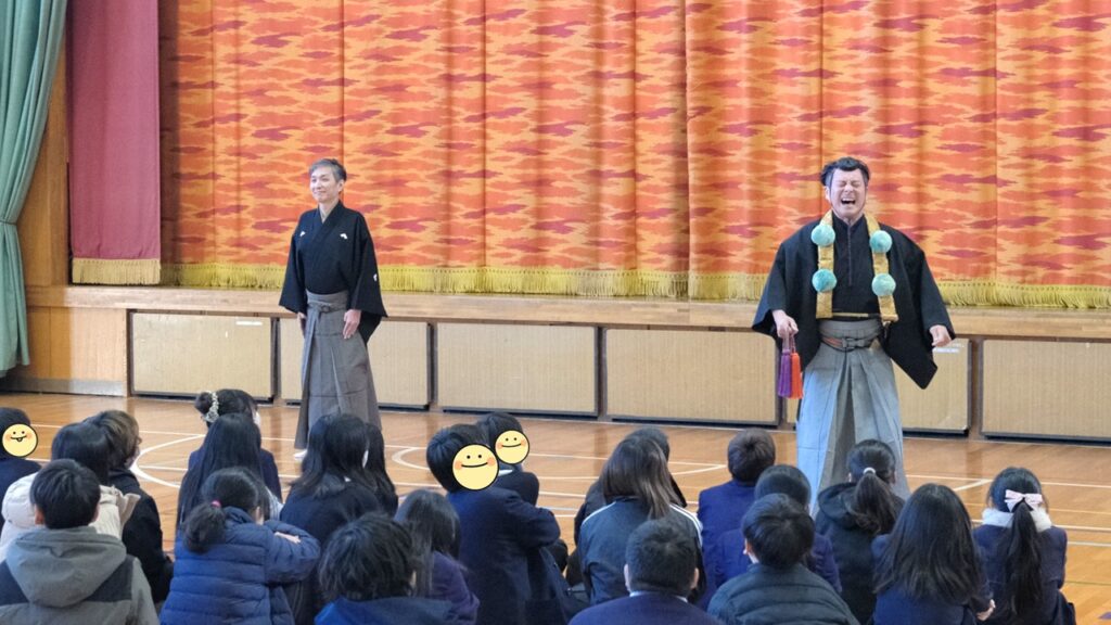今日は、小学校6年生に向けて実施された、狂言師の茂山千之丞先生、鈴木実先生、山下守之先生による、狂言プログラムをご紹介します。