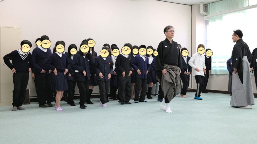 ワークショップでは、基本の姿勢やすり足、話し方などを、狂言師の皆さんと一緒に体験しました。