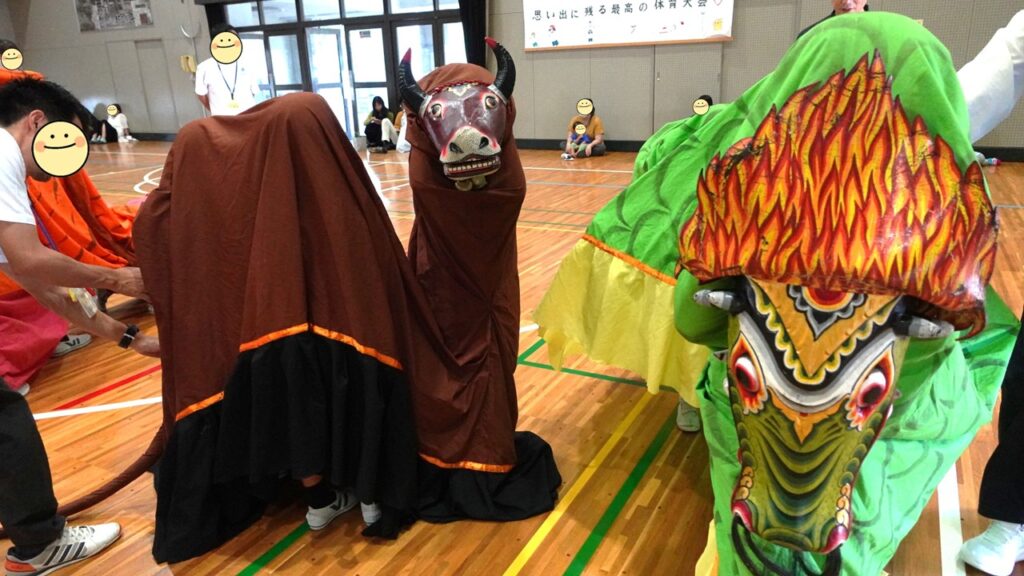 ガムラン音楽には楽譜はありませんが、ハナジョスさんから演奏する楽器や音を鳴らすタイミングを教えてもらい、獅子舞では、頭・胴体・しっぽの3人が役割を交代しつつ、それぞれが協力して、どうしたらリアルに見えるかを相談しながら取り組みました。