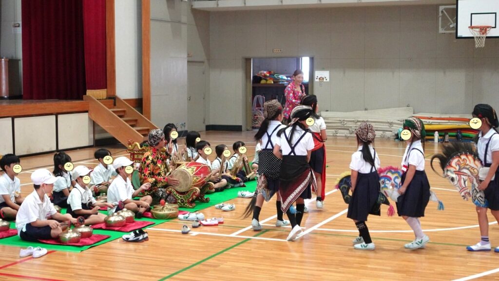 ハナジョスさんによる演奏や踊りを鑑賞したら、それぞれの役割に分かれて、踊り方や楽器の鳴らし方を教えてもらい、おまつりの発表に向けてハナジョスさんと一緒に練習しました。