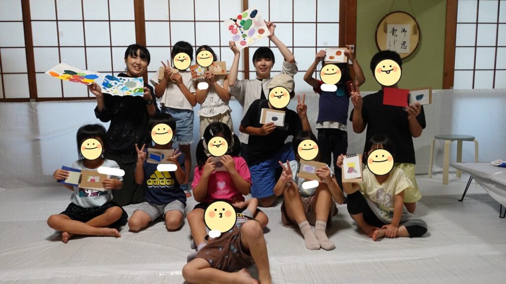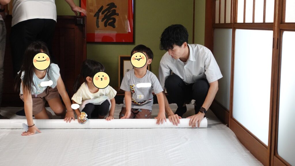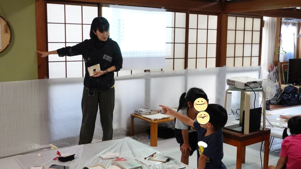 いづはまスマイル食堂には、食堂やワークショップに慣れていて、お手伝いをしてくれる「こどもスタッフ」がいます。この日、食堂に到着すると、早速こどもスタッフのみんなが荷物を運んだり、床が汚れないようにシートを敷くお手伝いをしてくれました。子どもたちは、はじめましての野原さんともすぐに打ち解けて、親戚のお姉さんが遊びに来たような光景です。