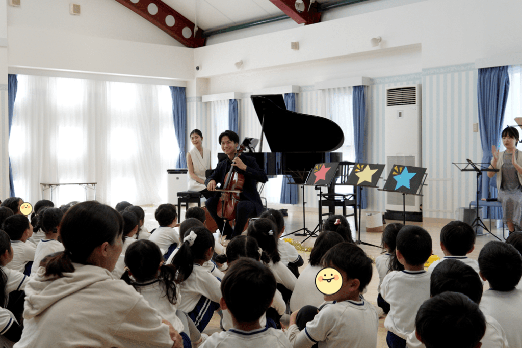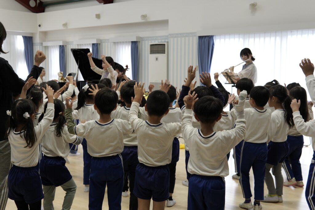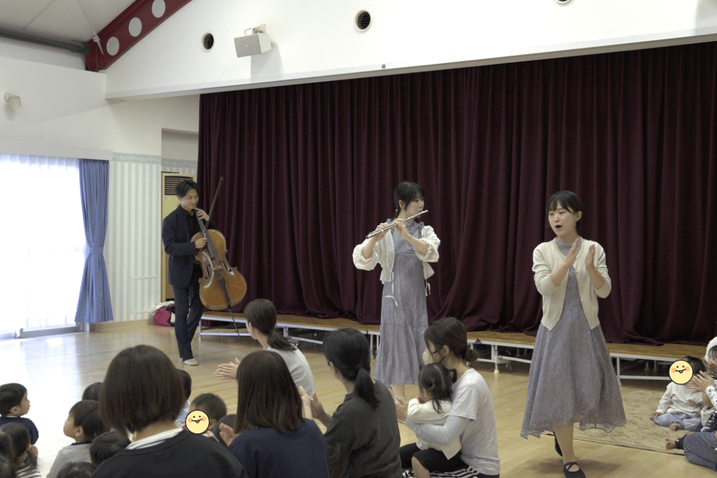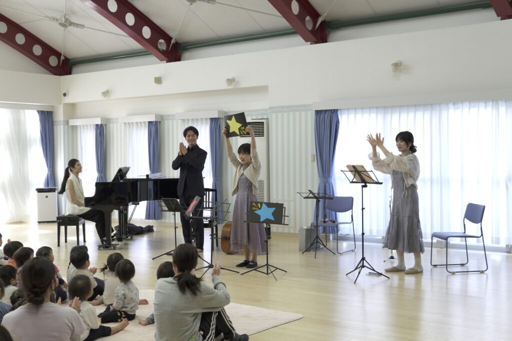 わくわくした様子のこどもたちの前に、『さんぽ』の音楽とともに現れたのは、ソプラノの防野莉安さん、フルートの伴菜生さん、チェロの大熊勇希さん、ピアノの板倉理子さんの4人のお兄さん・お姉さんたち。