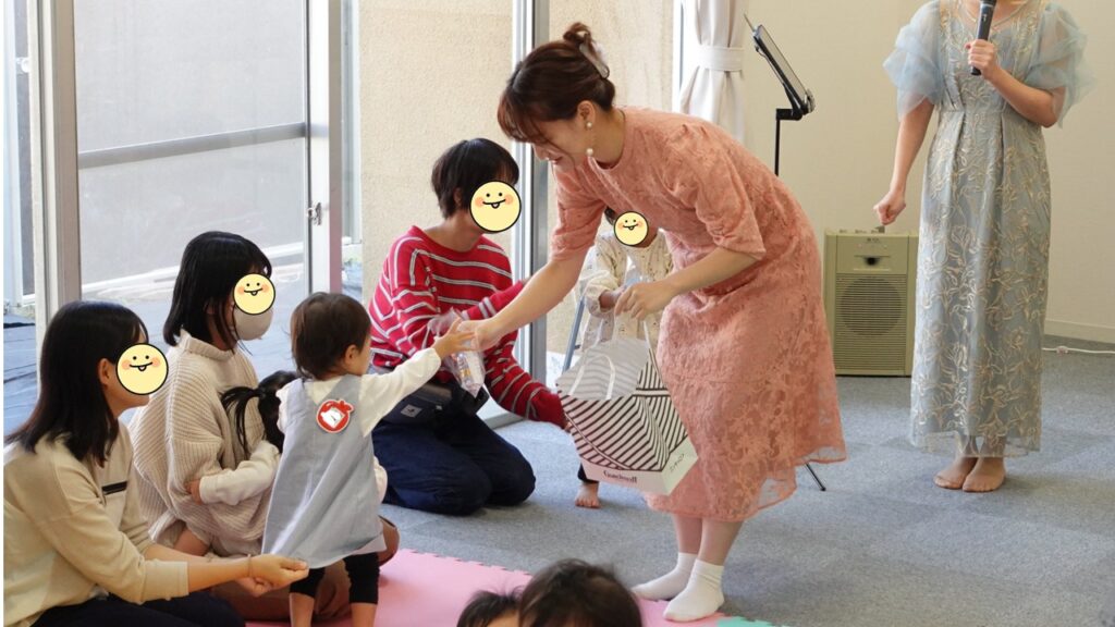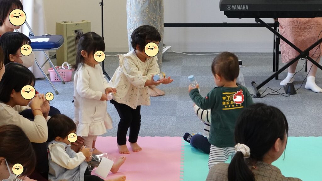 1人1人に手渡すと、きらきらした楽器に子どもたちは大興奮です。