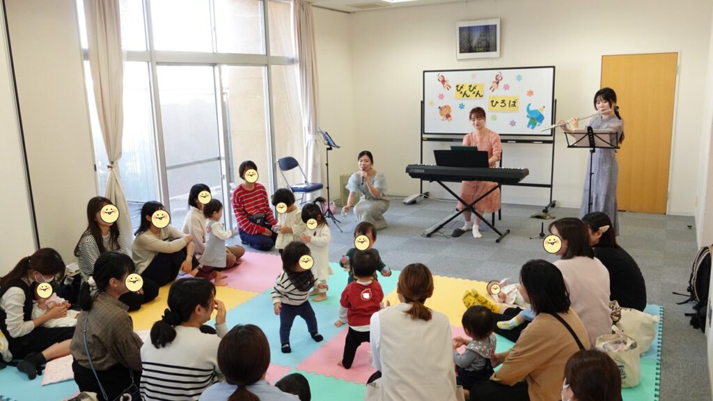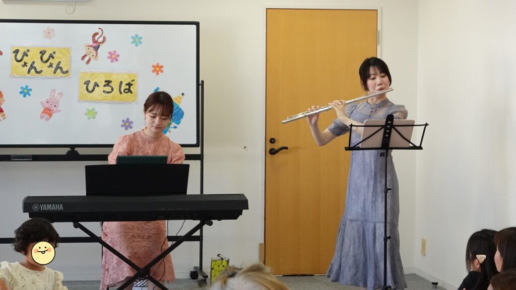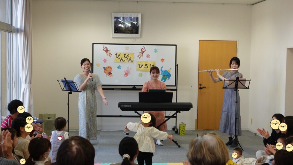 今回はフルートの伴菜生さん(堺市新進アーティストバンク登録者)が、歌の鳩山冴映さんと、ピアノの橋本由羽さんと一緒に子育てひろばに来てくれました。