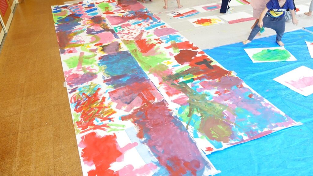 こどもたちはたくさんの絵の具と広がる色に夢中です。もう1つ用意されていたスポンジのハケも使いながらダイナミックに動いているうちに、色がどんどん重なり、大きくてカラフルな色紙ができあがりました!