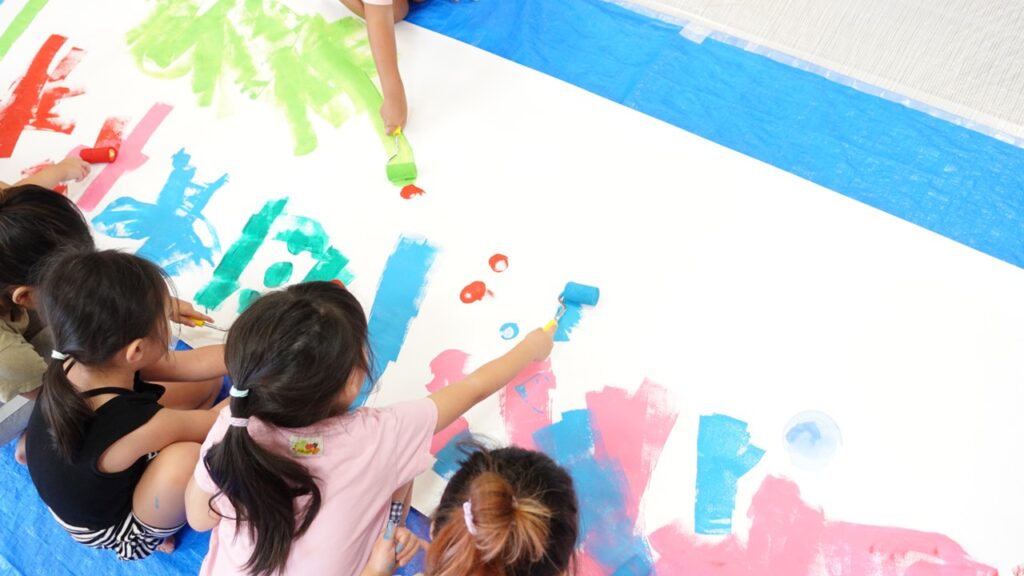 いつもの園のホールには、大きな紙と、たくさんの絵の具、それからローラーが準備されています。