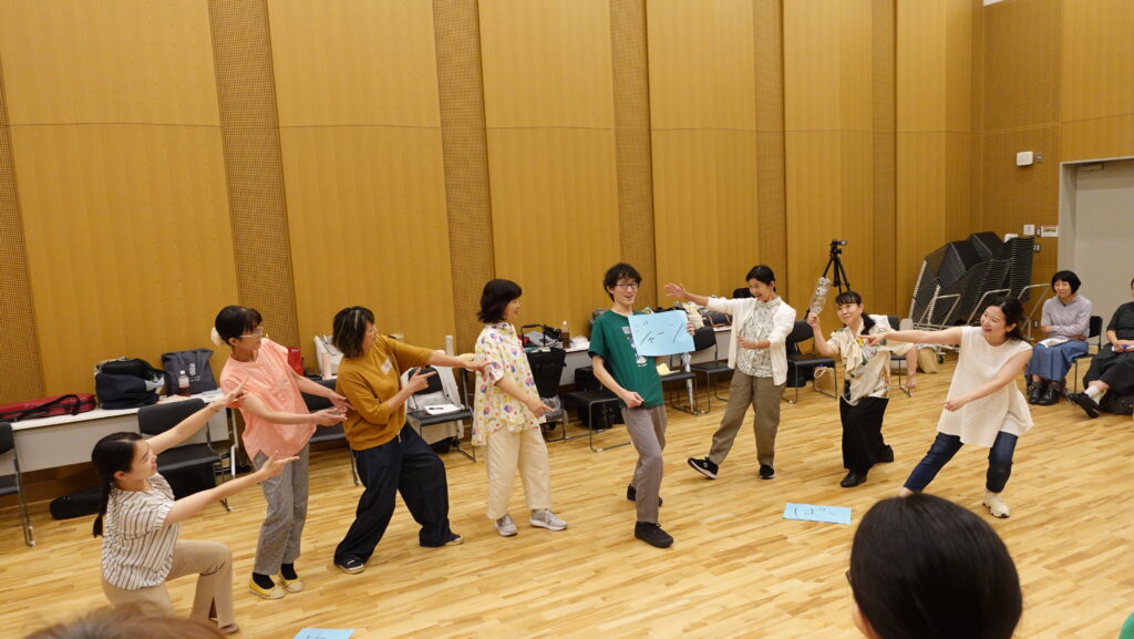 2日目は、最終日の実践に向けて、ワークや音楽のアイディアを膨らませていきながら、ワークショップ参加者にとって分かりやすいリードや、音楽的なフォローの仕方を探ります。古橋さんからの具体的なアドバイスによって、受講生たちの表情や身体の動かし方、声がけが、みるみるうちに変化していきます。