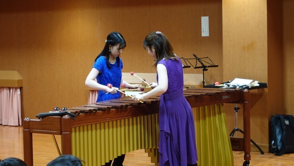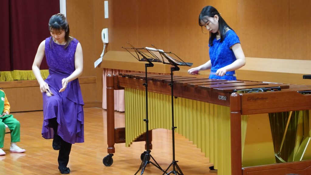 今日はマリンバ奏者の井塞鈴菜さん(堺市新進アーティストバンク登録者)と宮本優花さんがやってきました。