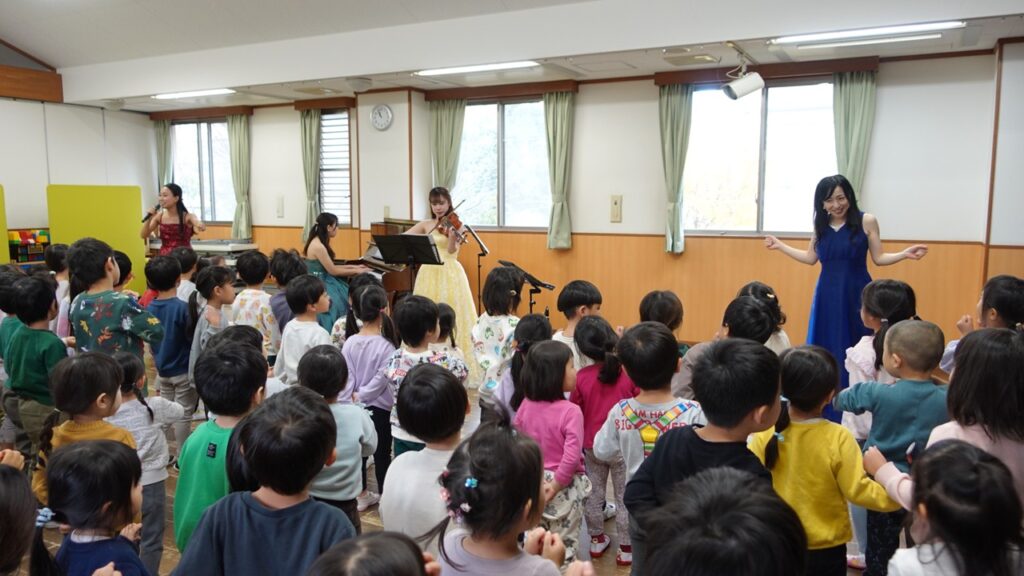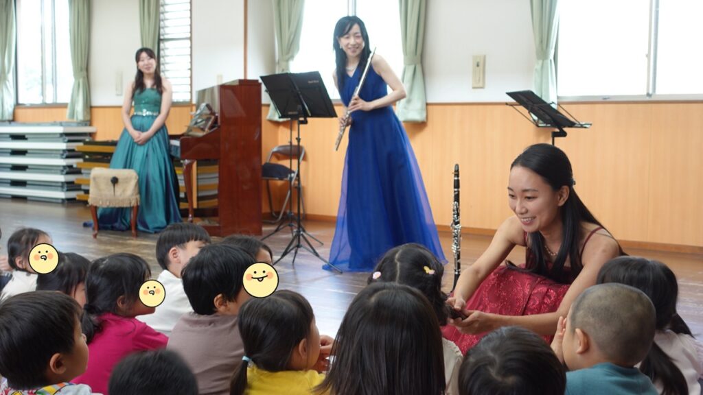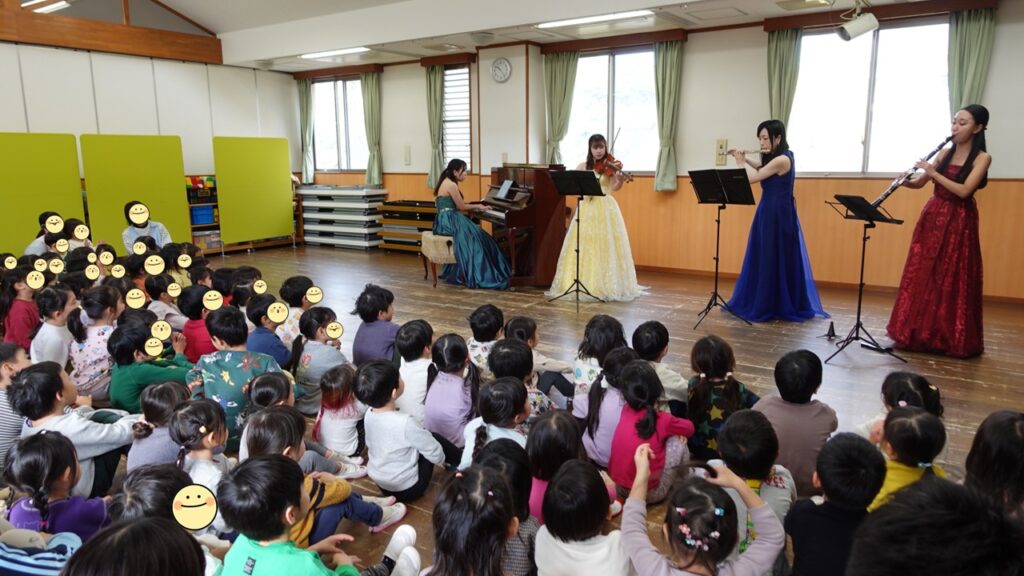 クラリネットの南方美穂さん(堺市新進アーティストバンク登録者)と、フルートの重本千晴さん、ヴァイオリンの西本彩友美さん、ピアノの北一恵さんの4人がこども園にやってきました!