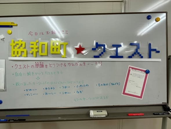 この日は、クエストの問題を貼るための看板をみんなで飾り付けます。