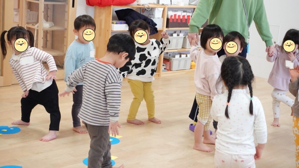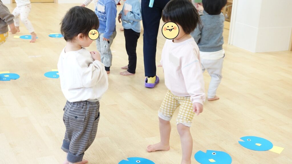 1人ずつおさかなさんを並べて、ジャンプで飛び越えたり、後ろ向きに歩いてみたりもしました。上手にできたかな?